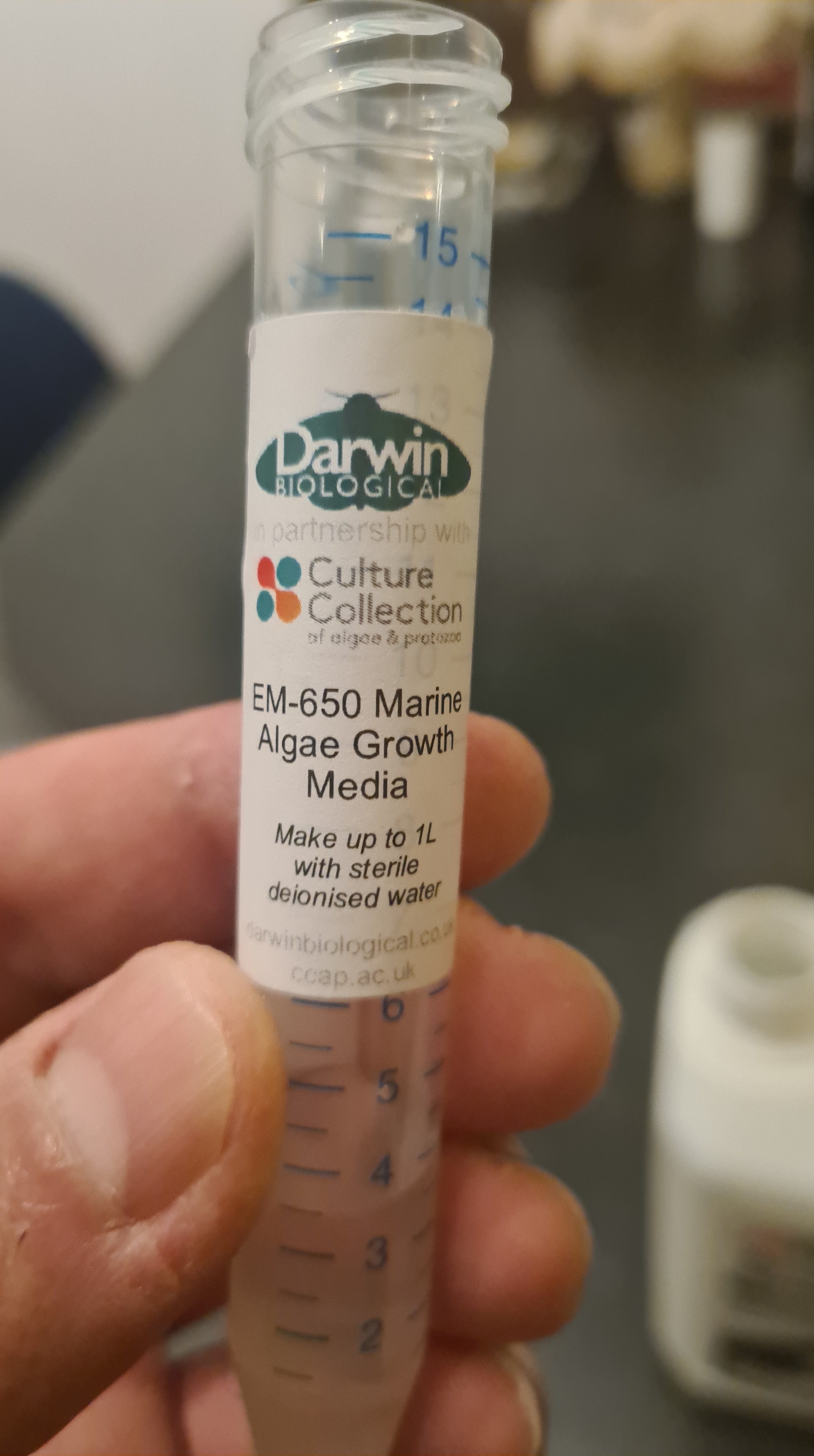 after getting myself a few jars, some medium and a grow light i started growing the lunula. i bought a sample of it from CCAP (culture collection of algae and protozoa, a UK based lab) for around £20, and i received a 30ml vial quite packed with algae. i started by dividing the algae in 3 jars, 10ml per jar, and added 100ml of saltwater. the directions from DR. Wnuk were to always try to propagate with a 1/10 ratio of culture and new saltwater. the medium i used contains a selection of chemicals and trace minerals to act as a nutrient, and the grow light has to be a full spectrum light. they prefer a temperature between 18 and 25 degrees C, and they should be exposed to light on a stable rhythm of 12 hours light and 12 hours dark.