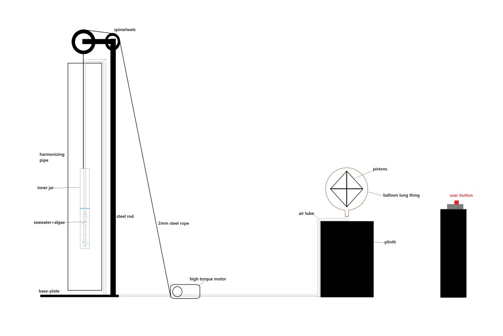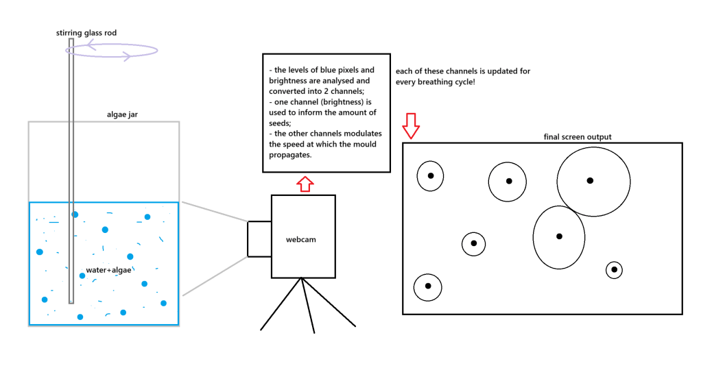 – the pipe organ: a flexible tube will direct the lung’s air towards the pipe. the tube would end up inside a smaller jar containing the algae. this smaller jar will be suspended into a transparent PVC tube called harmonizing tube. air would blow into the smaller jar, stressing the algae and creating bubbles. the motion of the bubbles would create a resonance with the harmonizing pipe. a few changes have happened since i’ve finished that schematic shown above: the harmonizing pipe would be suspended too, and I’m considering ditching the idea of raising or lowering the smaller jar. I was hoping that by raising and lowering I could influence the pitch of the harmonics, but the difference is not very noticeable – it would go from a specific tone to pink noise, basically… maybe more experimentation should be done by modulating the openings of the harmonizing pipe IE was thinking about glass bottles, and how clean the tone is when some air is blown at the right angle through the opening. glass bottles usually have a narrower neck, so there’s the possibility that it’s that bottleneck (no pun intended) that allows for more complex harmonics??? anyways, a webcam would be pointed at the jar containing the algae. reading the colour values given off by the stimulated culture can be used to influence the lung, creating a interdependence between the lung and the organ.